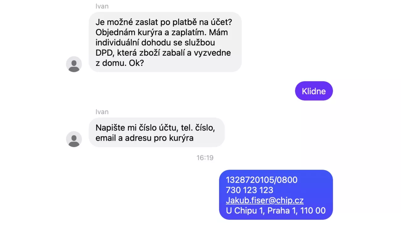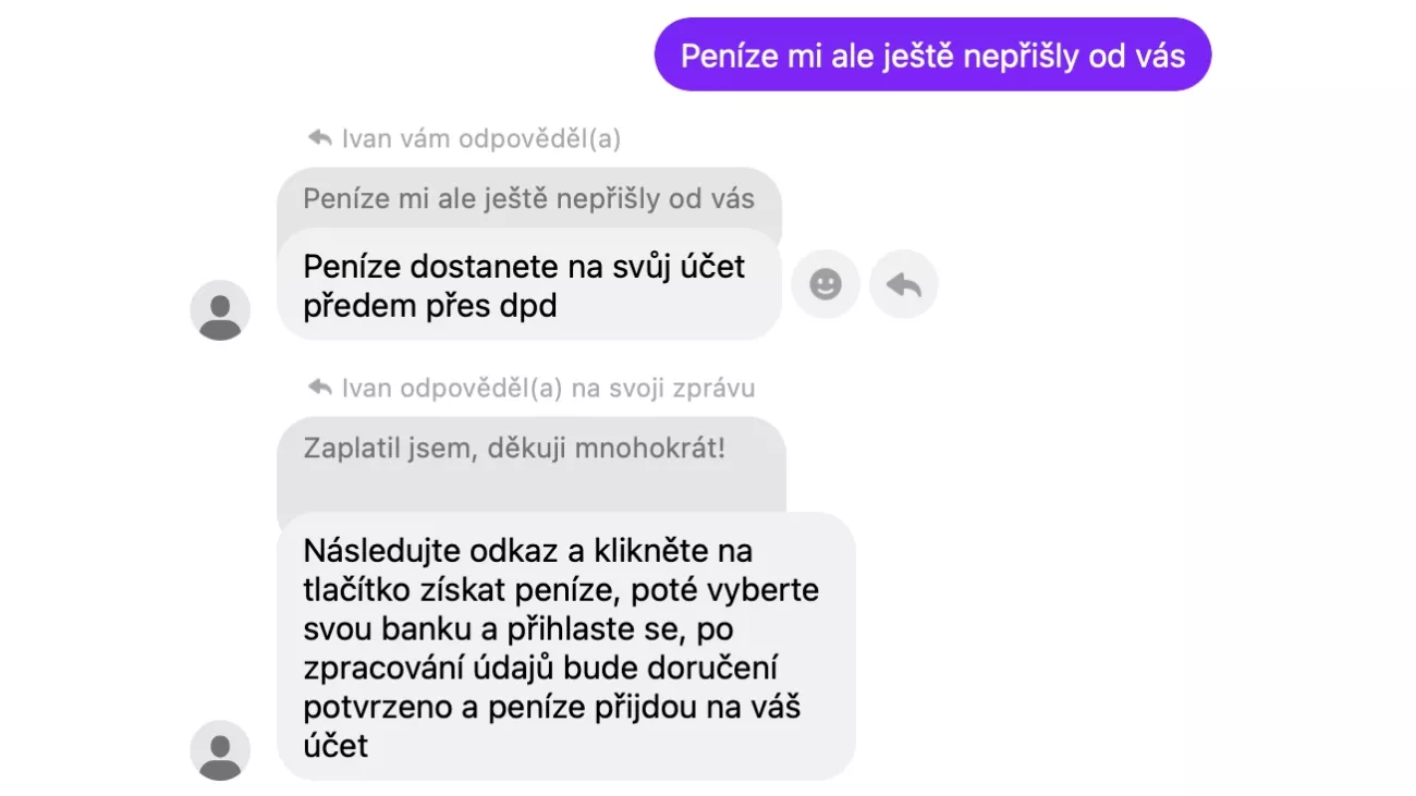 Na Facebook Marketplace nás při prodeji nepotřebného oblečení oslovil podvodník. Nu, kdyby jeden – bylo jich cca 5 nebo 6, první se začali ozývat asi půl hodiny po publikaci inzerátů. Právě na Marketplacu je s tím obrovský problém, falešné či ukradené účty píšou prakticky na všechny inzeráty.