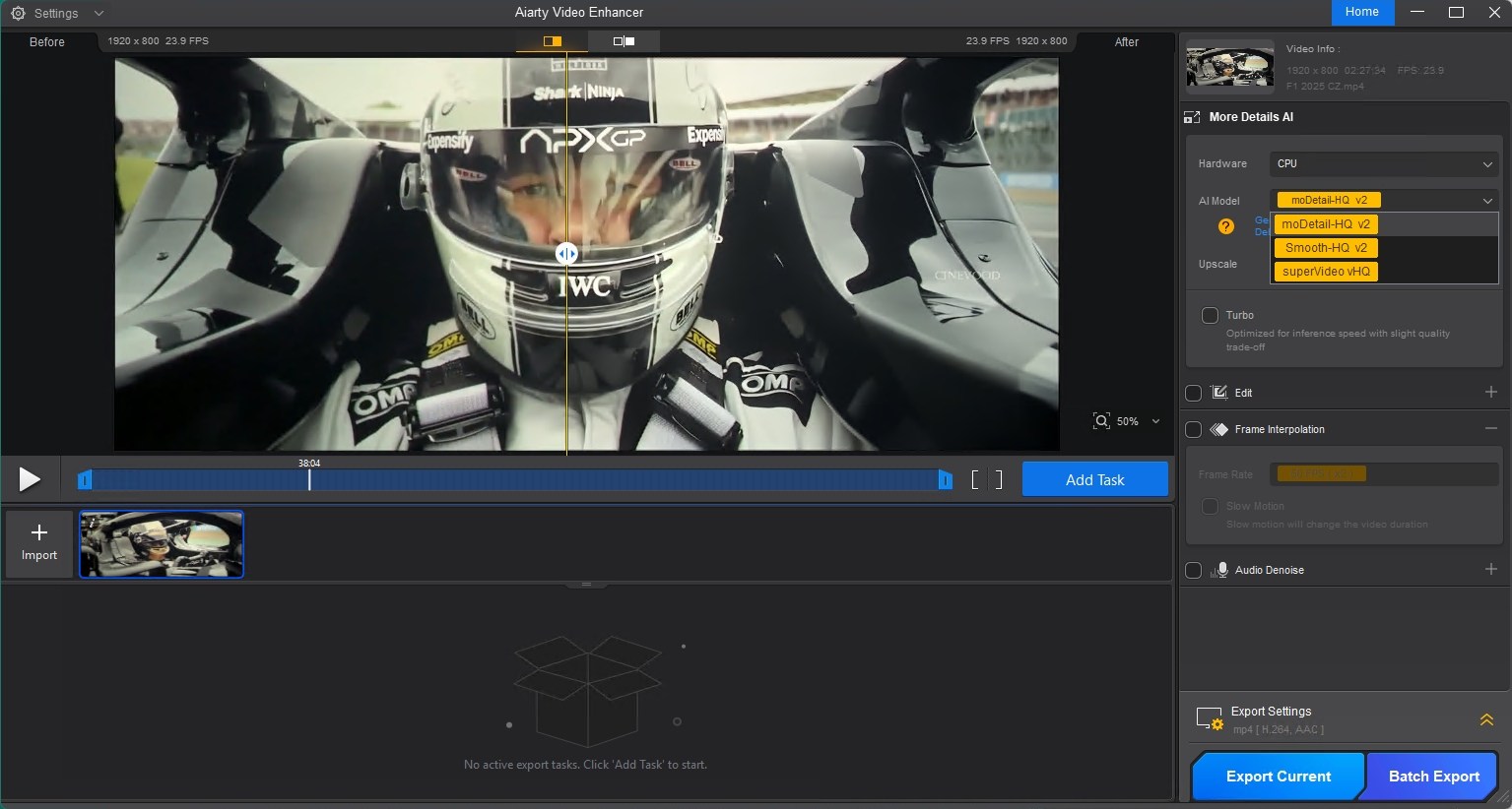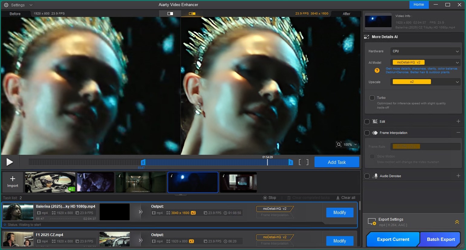 Aiarty Video Enhancer je výkonný software využívající pokročilé AI technologie k vylepšení videí díky funkcím jako denoise, deblur, 4K upscaling, interpolace snímků a audio denoise.