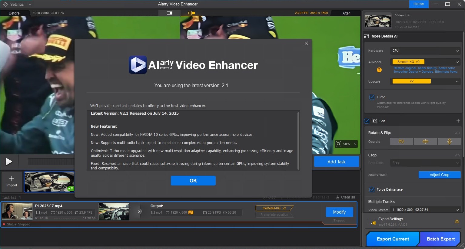 Aiarty Video Enhancer je výkonný software využívající pokročilé AI technologie k vylepšení videí díky funkcím jako denoise, deblur, 4K upscaling, interpolace snímků a audio denoise. Software běží lokálně na Windows i macOS, což zajišťuje maximální soukromí – žádná data nejsou odesílána na server – a díky hardwarové akceleraci GPU na grafických kartách dokáže v Turbo režimu zpracovávat videa až třikrát rychleji než konkurenční řešení. Uživatel postupuje v přehledném workflow: import videí, výběr jednoho ze tří specializovaných AI modelů (moDetail‑HQ v2, Smooth‑HQ v2, superVideo vHQ), náhled a export ve formátech MP4 či MOV v kodecích H.264, H.265 nebo AV1. Uživatelé oceňují schopnost obnovit detaily v oblasti vlasů, textur a prostředí bez příliš nadměrného vyhlazení, přičemž software zvládá i scénáře s nízkým osvětlením a pohybem bez viditelných artefaktů. Funkce dávkového zpracování umožňuje automatické zpracování celých složek videí, což je efektivní pro tvůrce obsahu, YouTubery nebo archiváře, kteří pracují s velkým množstvím záběrů. Novinkou této verze je optimalizace AI modelů pro ještě vyšší rychlost díky technologiím TensorRT a CUDA s lepším využitím moderních GPU řad RTX 30, 40 a 50. Další informace najdete na produktové stránce a ve videorecenzi na YouTube.