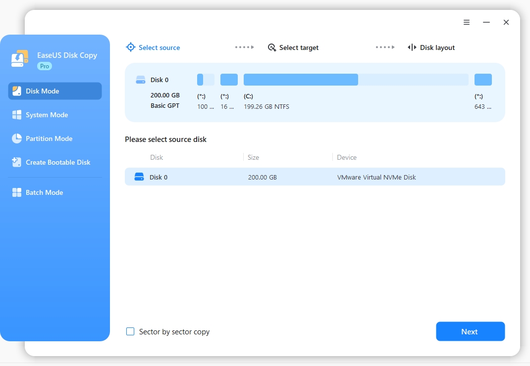 Pokud chcete naklonovat systémový disk s Windows, bude v průvodci nastavením označen pravděpodobně jako „Disk 0“. Označte jej a pokračujte kliknutím na „Next“ k volbě disku, na který chcete systémový disk zkopírovat. Pamatujte na to, že celý obsah cílového disku bude během kopírování smazán.