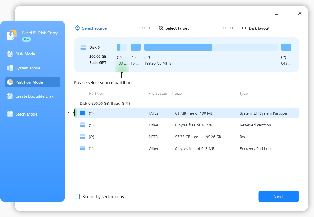 Po přepnutí do režimu „Partition Mode“ zobrazí EaseUS Disk Copy také jednotlivé diskové oddíly, které pak můžete zkopírovat samostatně. To se hodí třeba v případě, kdy instalujete do počítače nový systémový disk a ten stávající chcete ponechat jako úložiště filmů, fotek, hudby a jiných velkých dat.