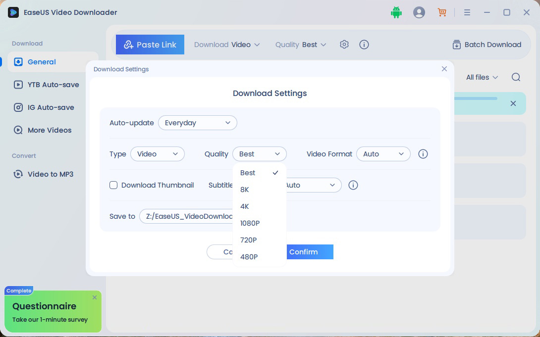 EaseUS Video Downloader podporuje širokou škálu webů včetně YouTube, Vimeo, Facebooku či Dailymotion, kde umožňuje stahování celých playlistů a kanálů. I když není interface lokalizovaný do češtiny, tak je přehledný a lze program doporučit i pro začátečníky. Dost důležitá je pravidelná aktualizace, protože provozovatelé videowebů a sociálních sítí často mění zabezpečení videoobsahu. Při stahování videa ve vysokém rozlišení 4K a 8K dochází k vytěžování výkonu počítače díky velkému datovému toku a objemům dat. Software neobsahuje žádný videopřevodník pro následný převod dat do potřebných formátů, což sice zachovává původní kvalitu, ale může to vést k nevyřešeným problémům, pokud je zdroj špatně kódovaný. Chybí pokročilé funkce jako stahování titulků nebo editace. EaseUS Video Downloader umí „stahovat při sledování“ (tj. video lze ukládat i během jeho přehrávání), a dále umožňuje automatické vypnutí počítače po dokončení stahování.