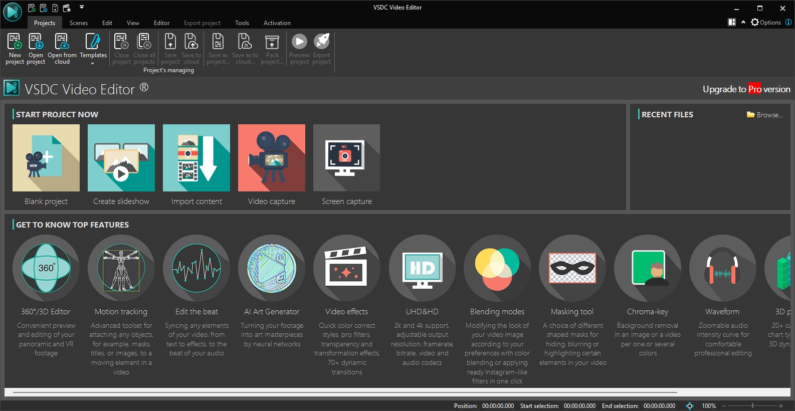 Úvodní obrazovka programu VSDC Video Editor vám pomůže správě založit váš nový video-projekt. Můžete otevřít prázdnou časovou osu a vložit na ni jednotlivé záběry, ale také začít vytvářet novou video-prezentaci z fotek nebo třeba pořídit záznam obsahu obrazovky vašeho počítače.
