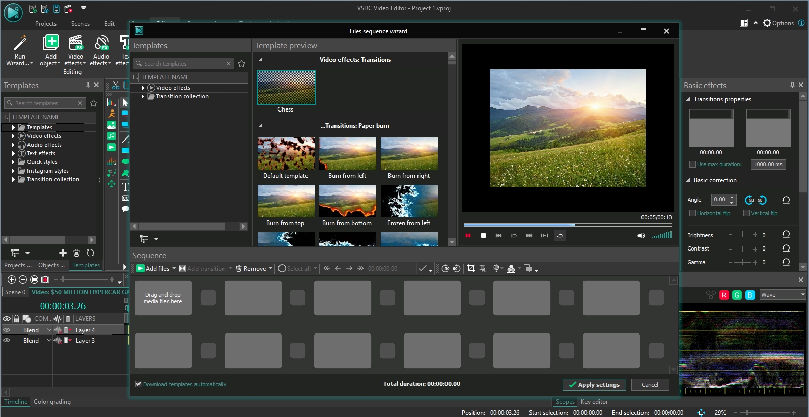 Nejen pro začátečníky může být tvorba vlastního filmu náročná a naučit se perfektně ovládat jakýkoli program na střih a pokročilou editaci videa zabere hodně času. Proto VSDC Video Editor nabízí i funkci průvodce, ve kterém stačí jen poskládat jednotlivé záběry a vložit mezi ně přechodové efekty. Najdete ji pod tlačítkem „Run Wizard“.