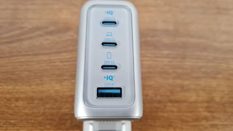Nabíječka obsahuje tři USB-C porty a jeden USB-A konektor. Celkový napájecí výkon činí 140 W, ale pokud k nabíječce připojíte všechna čtyři zařízení, celkový výkon klesne na 134 W a rozdělí se podle maximálního zatížení na 65 W (USB-C1), 45 W (USB-C2), 12 W (USB-C3) a 12 W (USB-A1). Pokud ale nabíjíte jen pomocí USB-C1, máte k dispozici celých 140 W, takže energií doplníte nejen lehké notebooky, ale i výkonné přenosné počítače.