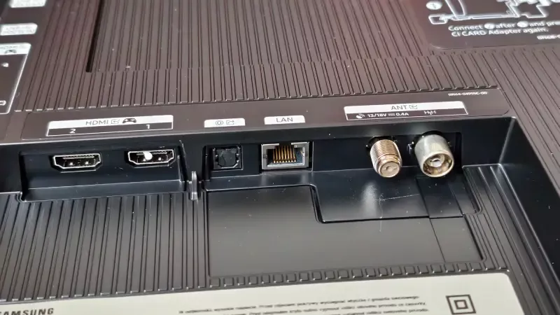 Portová nabídka je lehce nadstandardní. V první řadě má televizor zdvojené DVB-T2/C/S2 tunery, takže umožňuje současné sledování jednoho kanálu a záznam jiného. Pro připojení externích zařízení slouží čtveřice HDMI konektorů s podporou 120Hz zobrazení 4K obsahu, jeden HDMI konektor podporuje eARC pro připojení zvukové lišty. Vedle nich jsou dva USB-A porty pro přehrávání videa nebo zvuku z externího zdroje (pozor, přes veškeré zázraky s vylepšením obrazu pomocí AI stále nepodporuje DivX) a případný záznam. Samozřejmě nechybí LAN zdířka a bezdrátové adaptéry Wi-Fi 5 a Bluetooth 5.3.