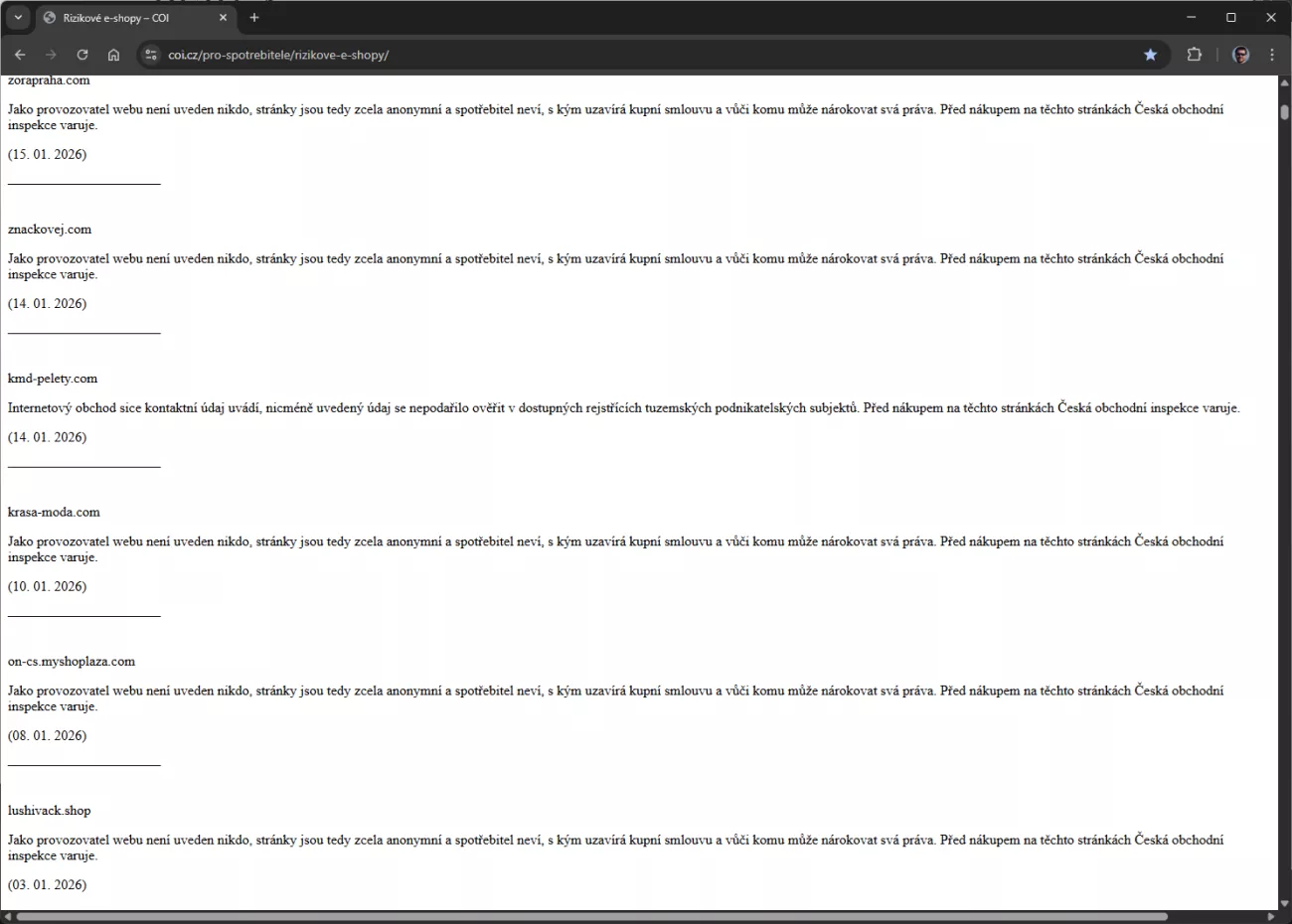 Česká obchodní inspekce u podobných webů standardně uvádí: "Jako provozovatel webu není uveden nikdo, stránky jsou tedy zcela anonymní a spotřebitel neví, s kým uzavírá kupní smlouvu a vůči komu může nárokovat svá práva. Před nákupem na těchto stránkách Česká obchodní inspekce varuje."
