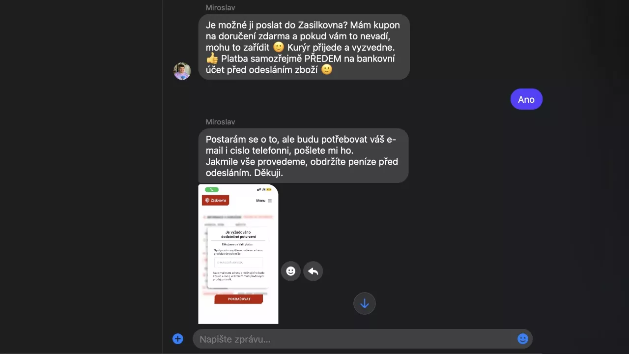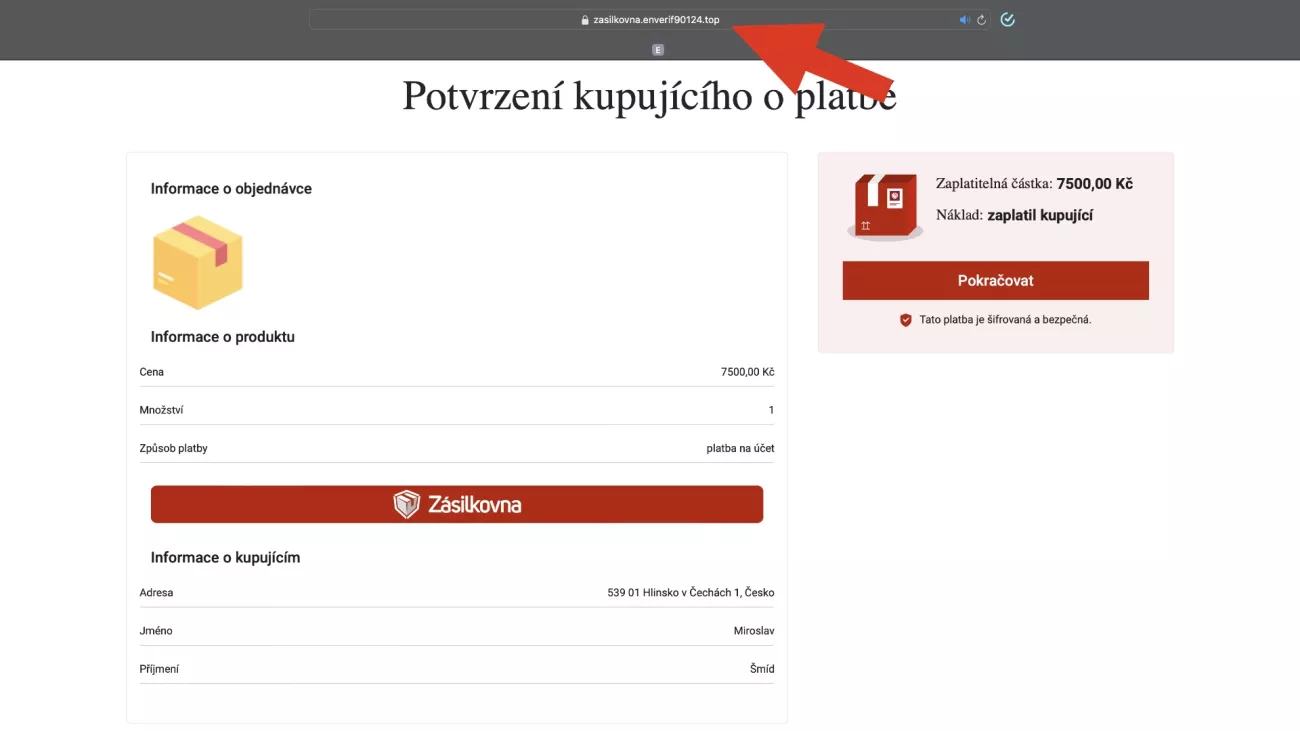 Podvodník vám většinou slíbí, že si zboží vyzvedne přes dopravní společnost. Odešle vám odkaz, který napodobuje skutečný web dopravce. Podvod je věrohodný, protože šmejd používá svou virtuální identitu (v našem případě Miroslav Šmíd, obyčejné české jméno) a také vymyšlenou adresu. Zkrátka všechno působí správně.