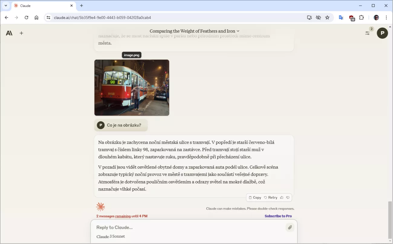 Claude neumí kreslit, ale s obrázky přeci jen pracuje. Dokáže totiž velmi dobře popsat jejich obsah. Stačí mu obrázek předložit a poprosit ho o komentář. A umí také generovat kód například v Pythonu.