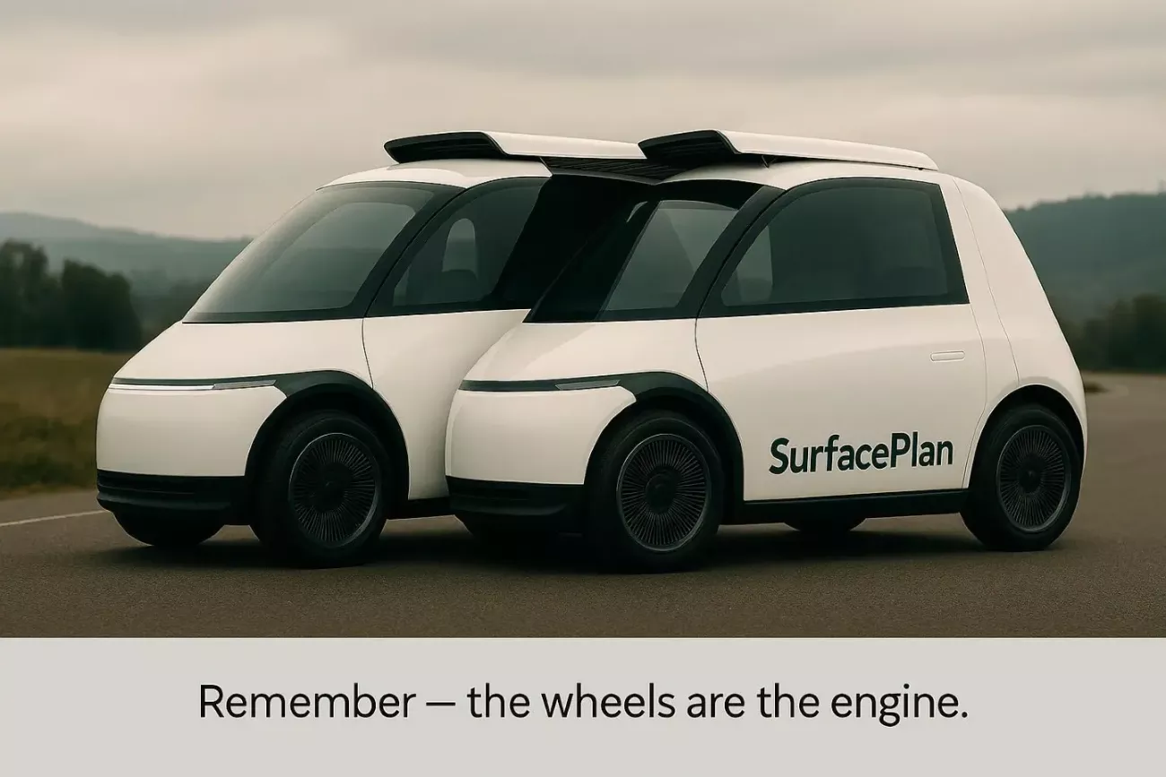David Henson má odvážnou vizi: jeho kolo SurfacePlan (známé také jako „Poke-to-Drive“) má v budoucnu fungovat bez motoru, nápravy nebo převodovky. Namísto tradičního principu využívá síť lineárních pohonů, což jsou v podstatě písty s pryžovými koncovkami, které se pod kontrolou umělé inteligence řízeně tlačí proti vozovce, a vytvářejí tak přímý pohon.