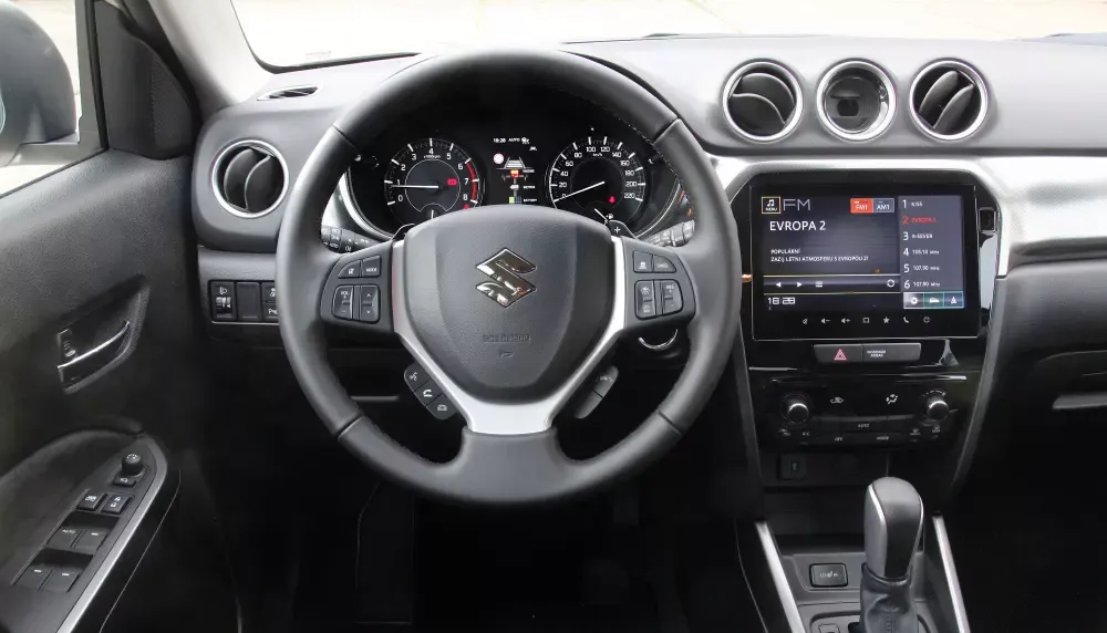Co se týká vnitřního vybavení a jízdních asistentů, Suzuki ladí Vitaru spíše do umírněného stylu. Zůstává například u klasického analogového otáčkoměru a rychloměru, i když mají nový úhledný design. Součástí přístrojového štítu je konfigurovatelný 4,2palcový barevný LCD multifunkční displej palubního počítače, který v reálném čase zobrazuje jízdní informace. Trochu archaicky působí jeho ovládání pomocí dvou plastových tyček trčících z analogových budíků. Ovládání na volantu by dnešním standardům asi odpovídalo víc, ale toto řešení je zato jednoduché, účelné a řidiče určitě ničím neurazí.