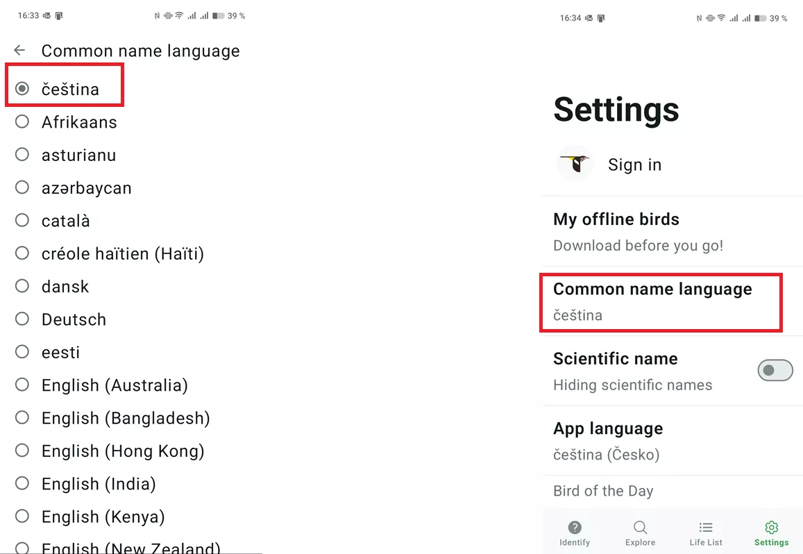 Aplikace komunikuje v angličtině, což by ale neměl být problém ani pro uživatele, kteří jí nevládnou. Ale dozvědět se, jaký pták to zrovna zpíval, v jazyce, kterému nerozumíte, by nedávalo příliš smysl. Proto se hodí možnost nastavit „Common name language“. Přejděte v aplikaci vpravo dole do nastavení (Settings), vyberte tuto volbu a jazyk z volte „čeština“. Jména ptáků budou v češtině.
