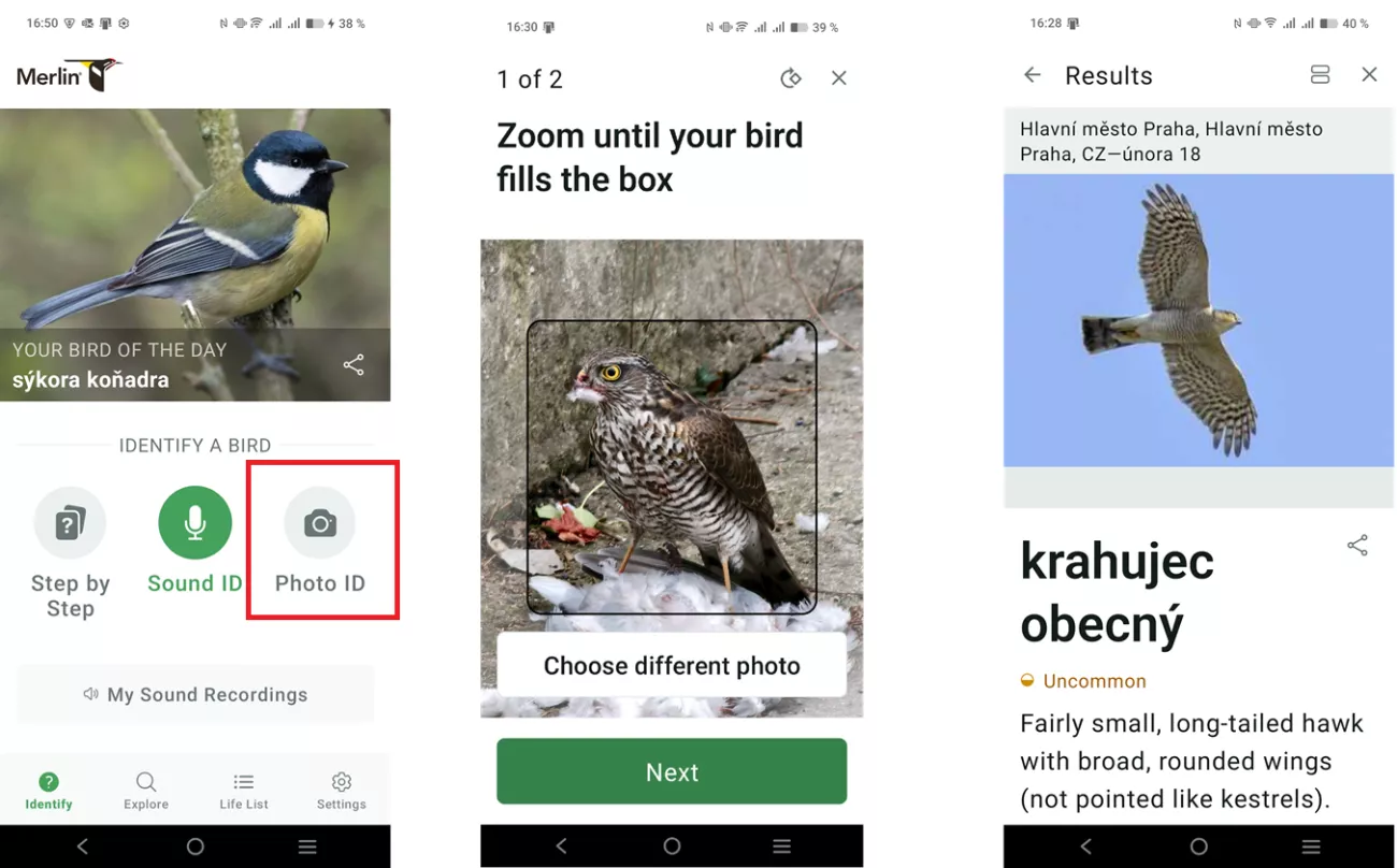 Rozpoznání podle fotografie (Photo ID): Máte fotku neznámého ptáka? Nahrajte ji do aplikace (přímo z galerie nebo vyfoťte novou) a Merlin se pokusí ptáka identifikovat. Umělá inteligence, trénovaná na milionech snímků, porovná vaši fotku s databází a navrhne nejpravděpodobnější druhy.