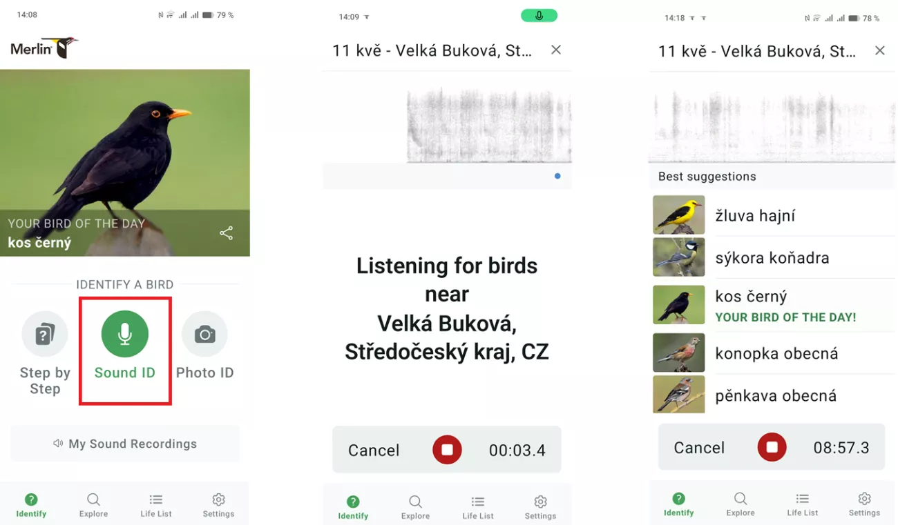 Rozpoznávání ptáků podle zpěvu - stačí kliknout na mikrofon a aplikace začne naslouchat. Vytvoří seznam ptáků v okolí. Zvýrazní se ten, který se právě zvukově projevuje.