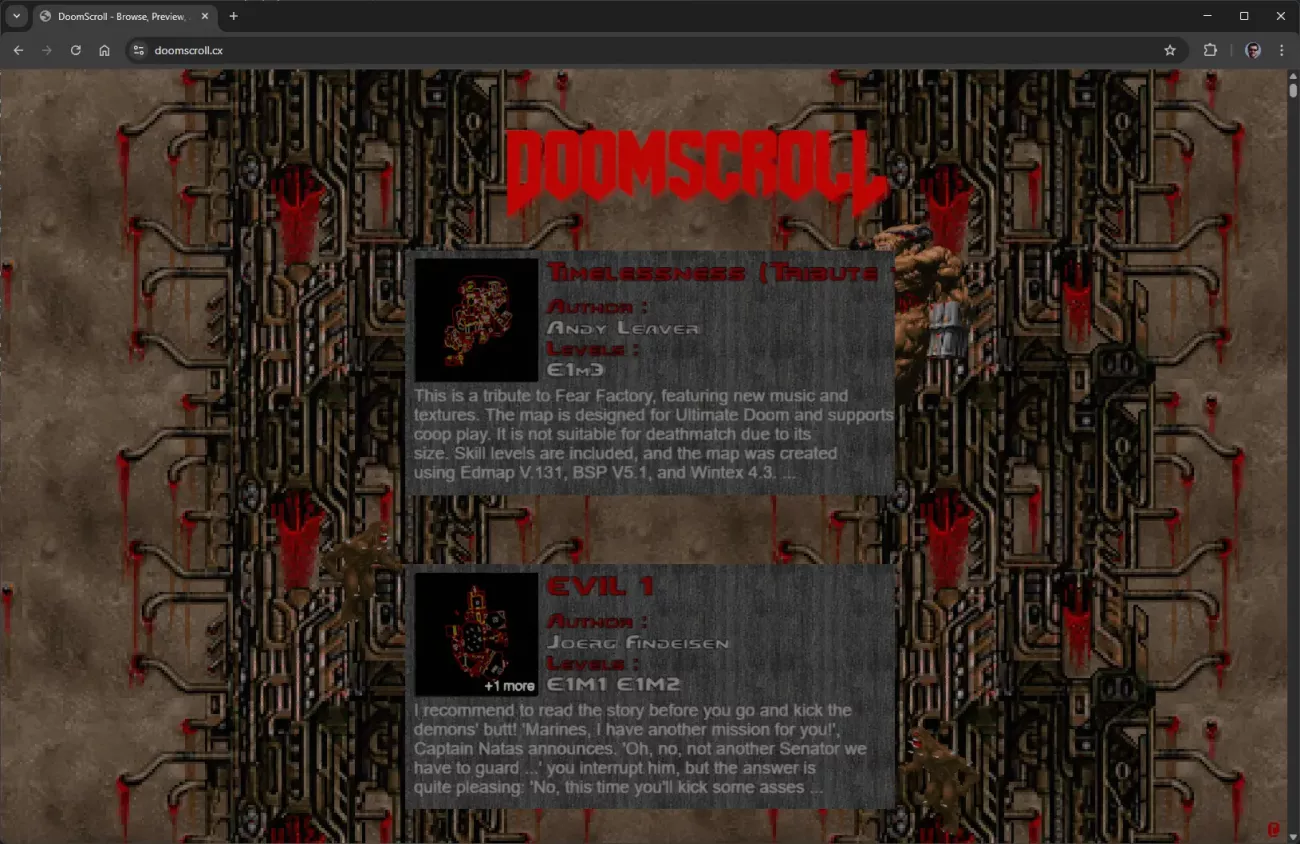 Rozhraní DoomScrollu je jednoduché a elegantní. Každá úroveň je zobrazena v malém šedém okénku s názvem, jménem autora, popisem a rotujícím drátovým náhledem mapy. Když na okénko kliknete, zobrazí se vám detailnější přehled na virtuálním bloku stylizovaném do podoby Doomu.