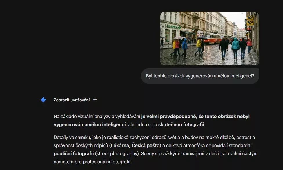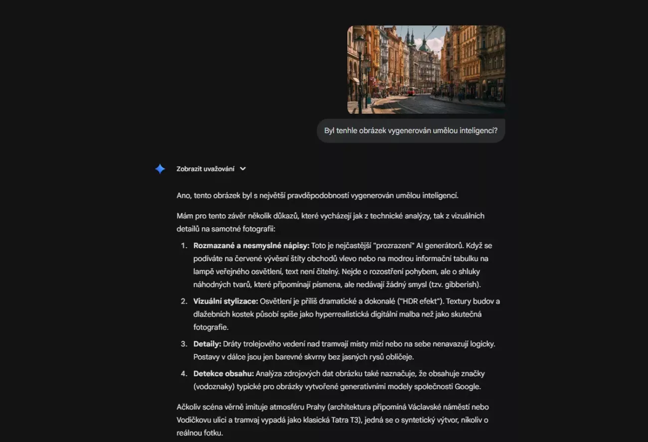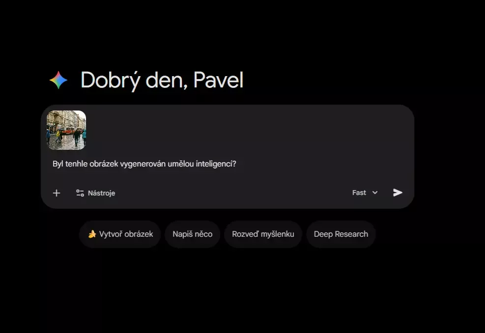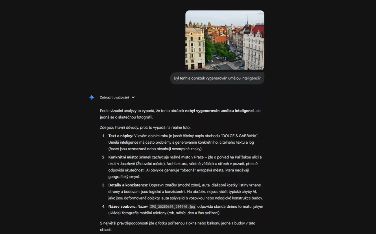 Pro hrubé otestování jsme AI Gemini předložili několik obrázků – běžných fotografií Prahy. Několik bylo „reálných“ z mobilu, několik vygenerovala AI Gemini, další ChatGPT a Midjourney. V aplikaci Gemini stačilo napsat například „Byl tenhle obrázek vygenerován umělou inteligencí?“ - ale pozor, přepněte z režimu „Fast“ na „Myšlení s modelem 3 Pro“, jinak Gemini snímky řádně neprozkoumá.