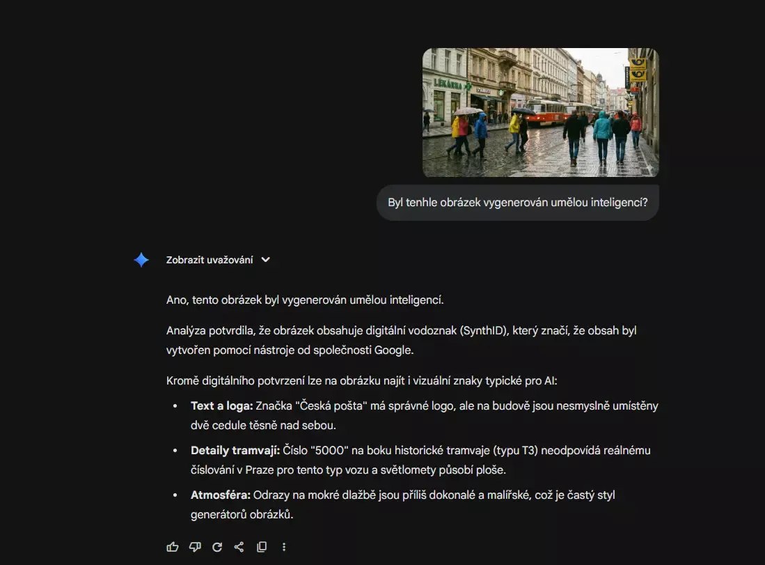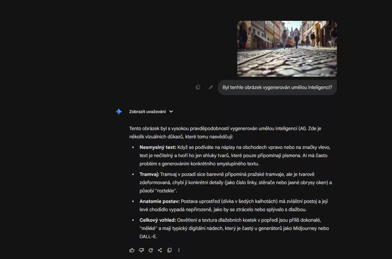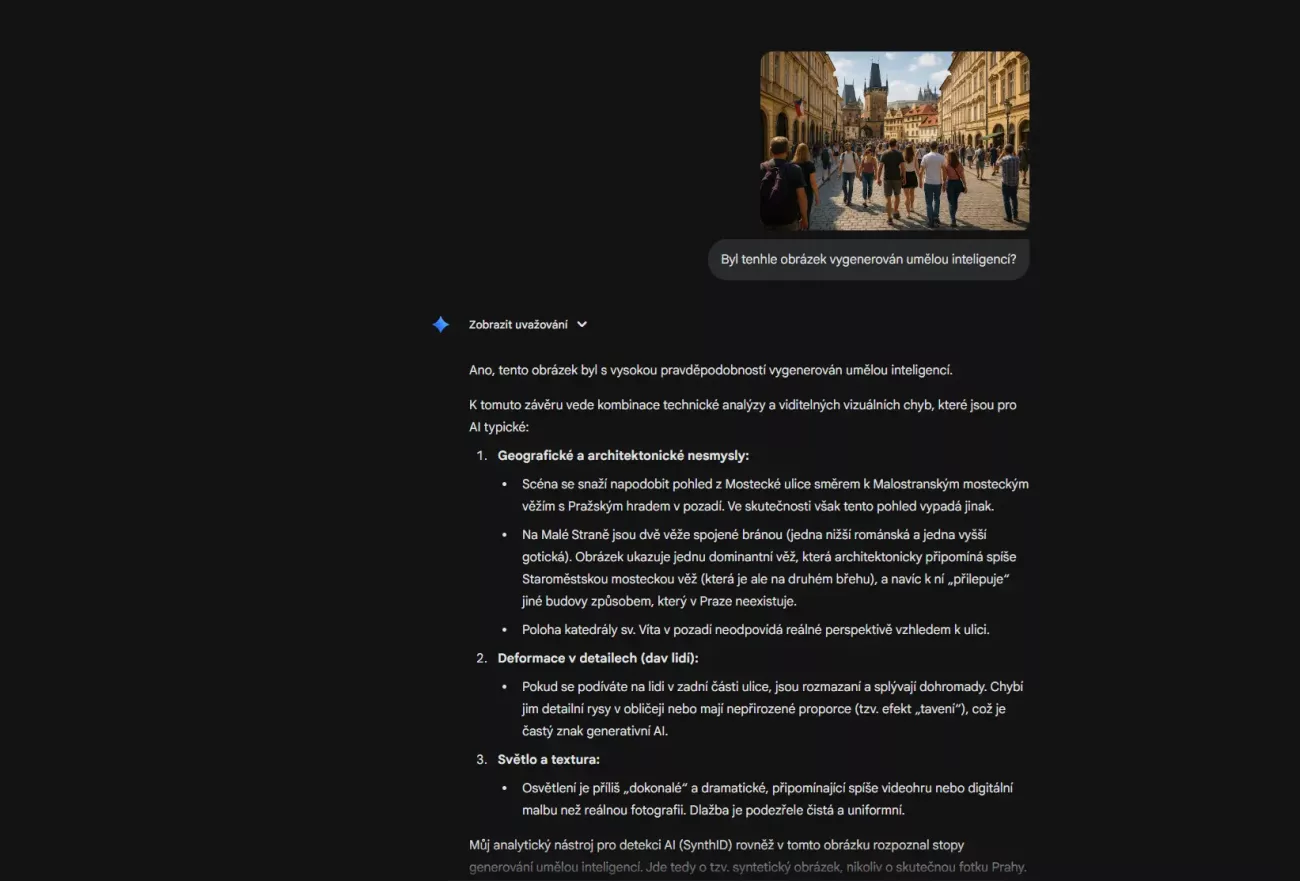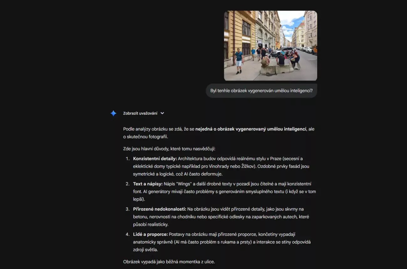 Pro hrubé otestování jsme AI Gemini předložili několik obrázků – běžných fotografií Prahy. Několik bylo „reálných“ z mobilu, několik vygenerovala AI Gemini, další ChatGPT a Midjourney. V aplikaci Gemini stačilo napsat například „Byl tenhle obrázek vygenerován umělou inteligencí?“ - ale pozor, přepněte z režimu „Fast“ na „Myšlení s modelem 3 Pro“, jinak Gemini snímky řádně neprozkoumá.