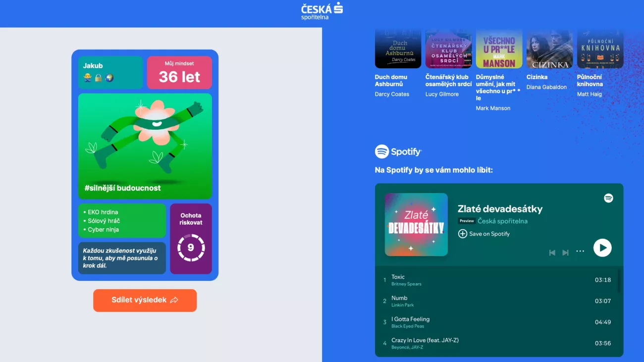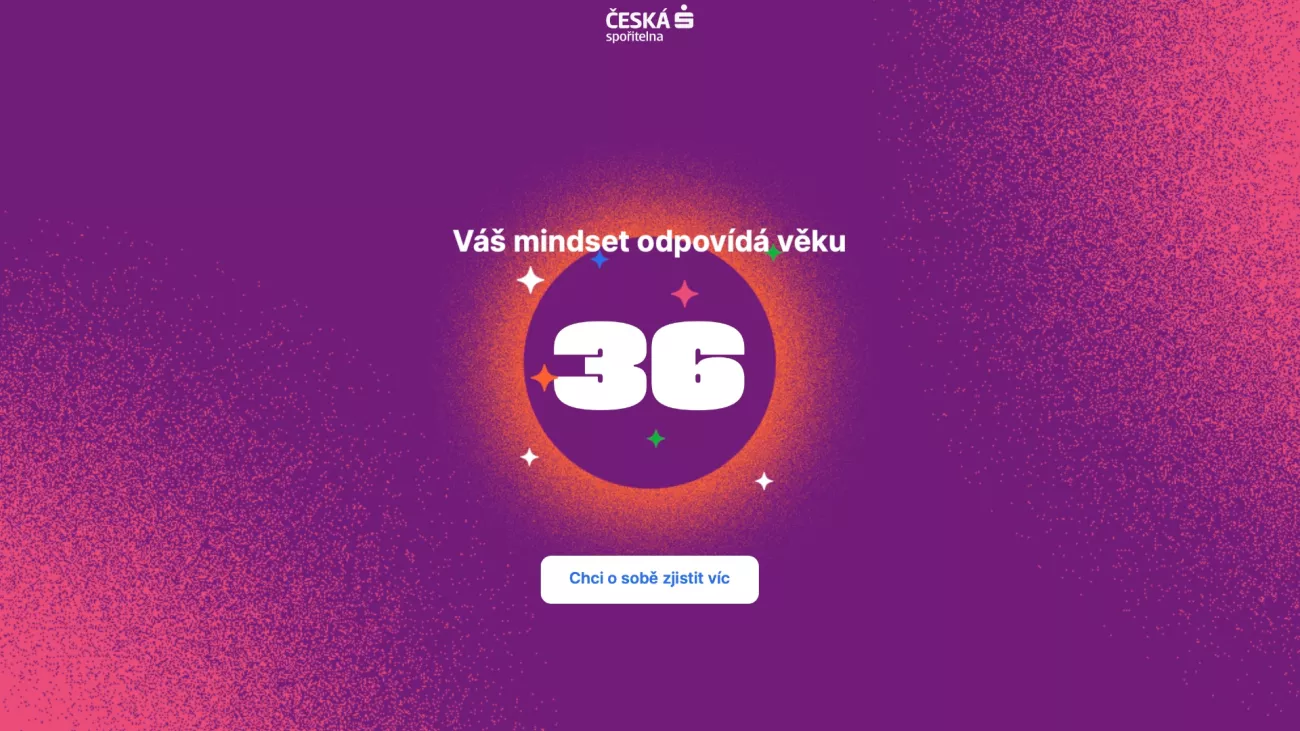 Na kampani pro největší bankovní společnost u nás se podílela reklamní agentura VML. „Mindset kalkulačka vám zabere jen chviličku a třeba zjistíte, že váš přístup k životu a pohled na svět okolo odpovídá úplně jinému věku, než je váš skutečný. Navíc vám kalkulačka doporučí i knížky a filmy, které by vám s ohledem na výsledek mohly sednout,“ cituje e15 ředitele agentury VML Tomáše Novotného.