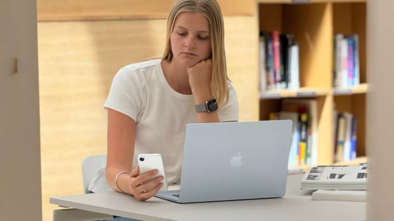 Studentka s MacBookem a iPhonem