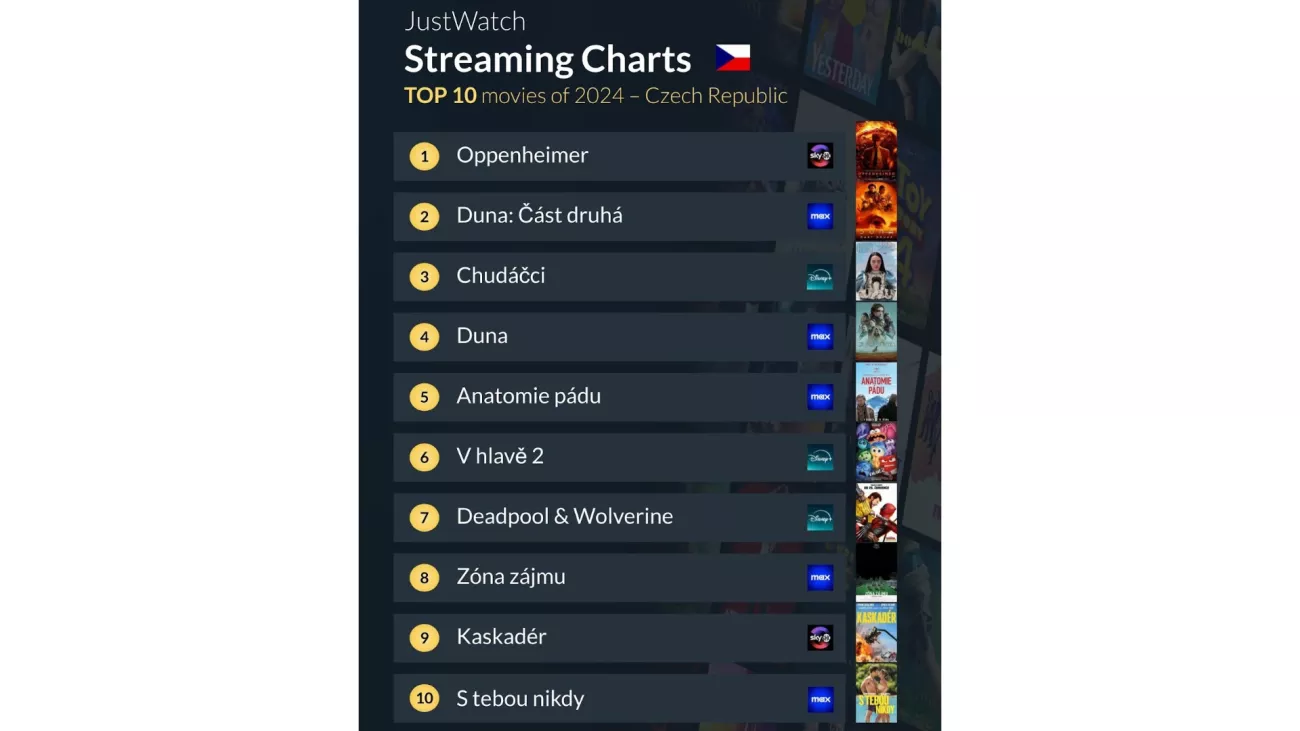 Druhou pozici drží epos Duna: Část druhá oscilující na pomezí sci-fi a fantasy. Tento film je ke zhlédnutí na platformě Max. Bronzové místo pak má „řecká divnost“ Chudáčci (v originále Poor Things) z Disney+ od režiséra Yorgose Lanthimose, jež stejně jako Oppenheimer bodovala na Oscarech. První pětku pak uzavírá první část Duny a francouzské drama Anatomie pádu (oba na Maxu).