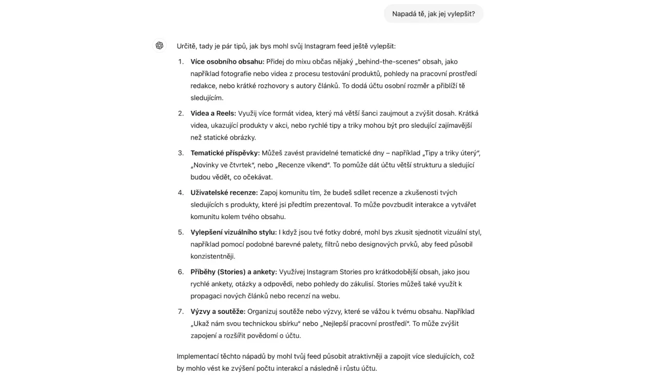 Následně jsme poprosili ChatGPT, aby zhodnotil náš Instagram spíše objektivně – a tady už bylo patrné, že k tomu přistupuje bez zjevné stylizace a více méně nudně popisuje, co vidí: