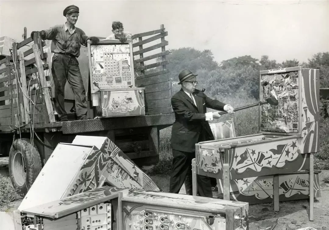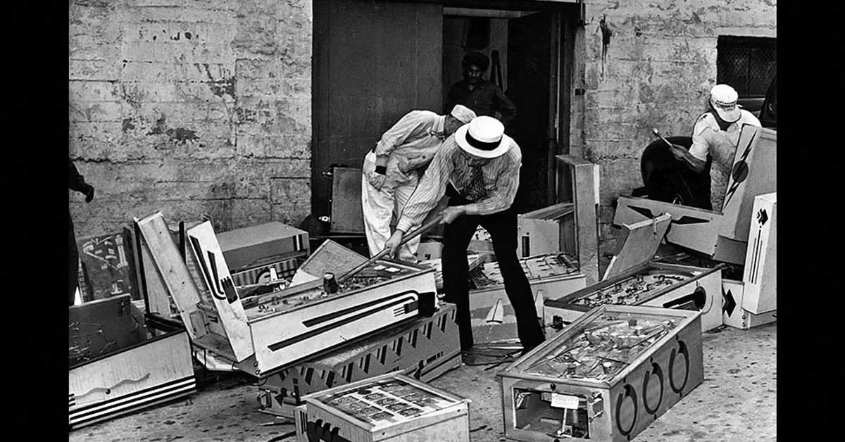 Ničení pinballů během prohibice. Byly zakázány v New Yorku i dalších velkých amerických městech, jako je Chicago a Los Angeles a to v letech 1940 až 1970.