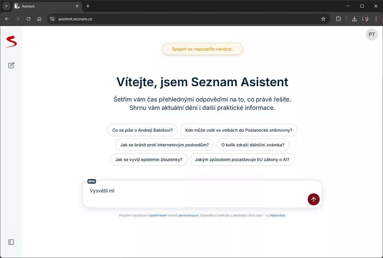 Asistenta jsme chtěli vyzkoušet, ale zobrazila se hláška "Spojení se nepodařilo navázat". To naznačuje, že služba je stále v raných fázích nasazování a má zatím omezenou kapacitu. Produkt tedy vyzkoušíme později.