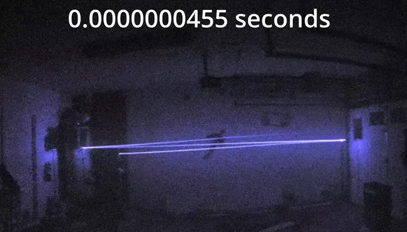 Finální záznamy ukazují něco úžasného - pulz světla, který jakoby pomalu plazí nebo odskakuje po místnosti. Ve skutečnosti světlo urazí za jeden snímek videa asi 15 centimetrů. Je to vzácná příležitost pochopit intuitivně rychlost světla, která je normálně pro lidské vnímání příliš rychlá.