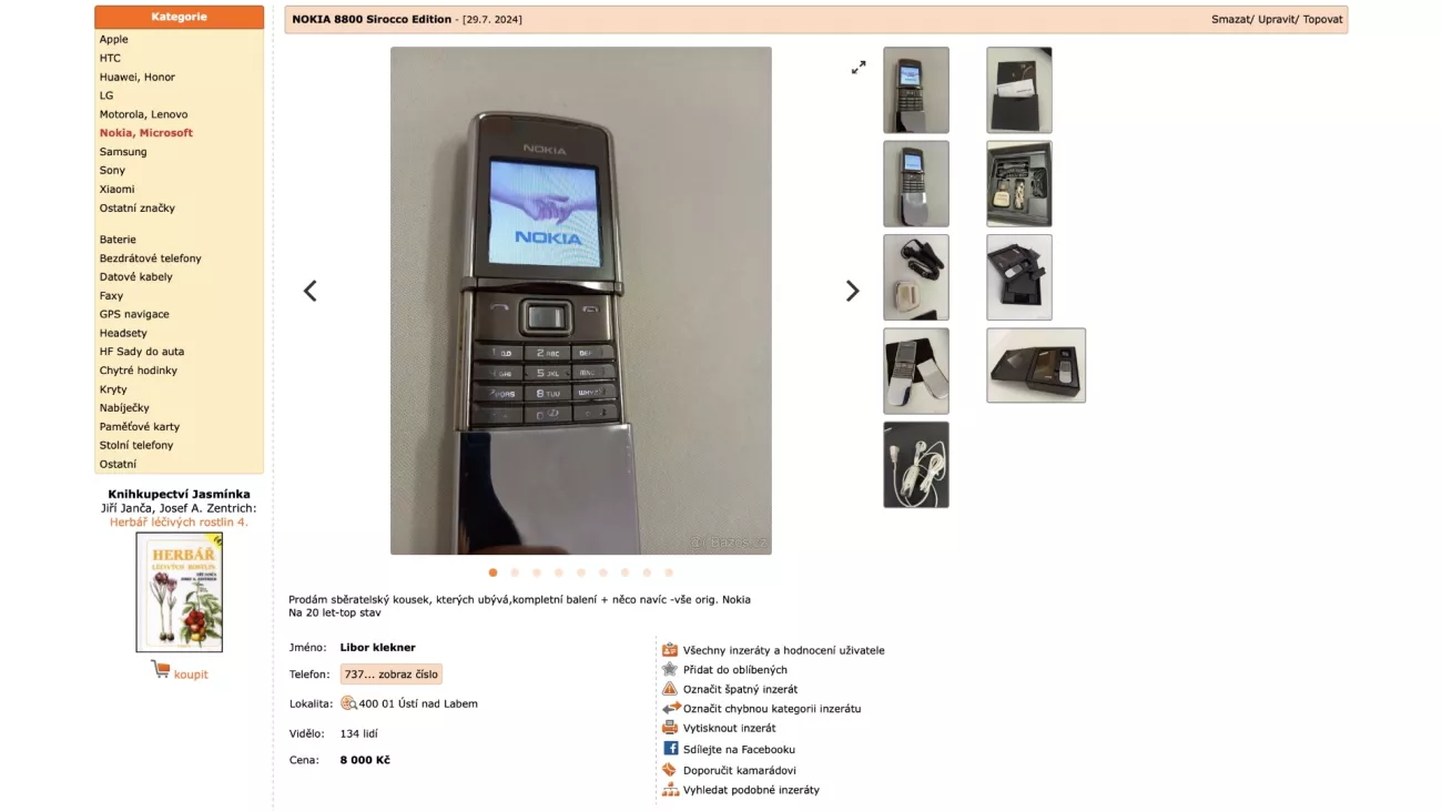 A nemusíme jít ani daleko. Například na českém inzertním portále Bazoš se čile obchoduje se starými telefony. Například Nokii 8800 Sirocco z roku 2007 zde prodáte za 8-10 tisíc korun, vyšší model Arte dokonce za 16 tisíc korun.