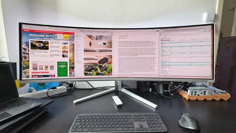 Díky extrémně širokému poměru stran 32:9 je monitor ideální nejen pro simulátory a závodní hry, ale i pro multitasking. Na plochu se pohodlně vejde několik oken vedle sebe, přehledně jsme dokonce mohli pracovat i s šesti vedle sebe umístěnými okny velikosti cca A4.