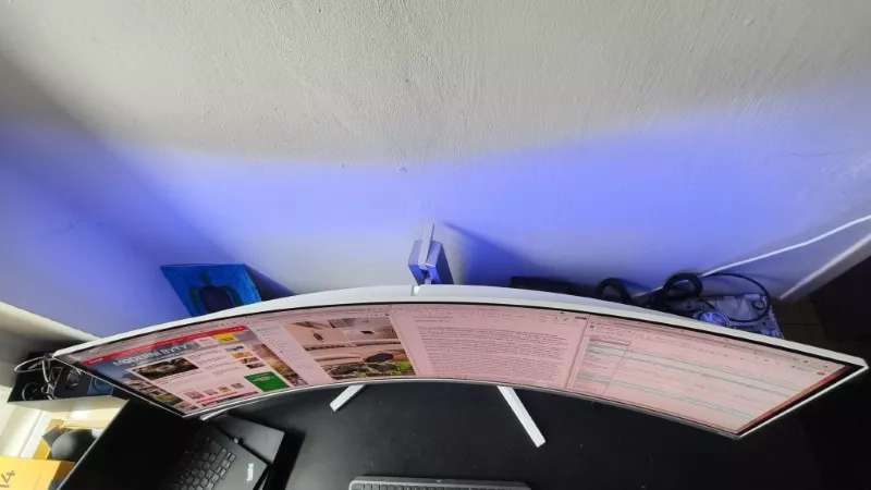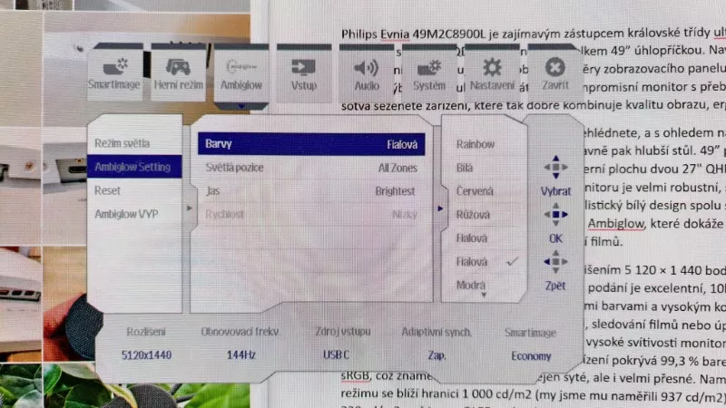 Výrazné prohnutí monitoru Philips Evnia 49M2C8900L a osvětlení Ambiglow.