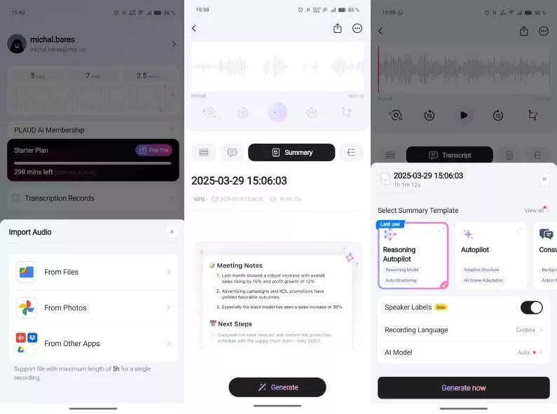 Genialita AI mikrofonu Plau NotePin se naplno projeví až v kombinaci se softwarem a AI funkcemi. Plaud chytře místo vývoje vlastních základních modelů integroval jazykové modely třetích stran, konkrétně GPT-4o a o3-mini od OpenAI spolu s Claude 3.5 Sonnet od Anthropic. Uživatelé si tak mohou vybrat, který z těchto modelů preferují pro přepis a sumarizaci, ale nám se nejvíce osvědčil automatický režim, který se adaptuje na daný obsah.