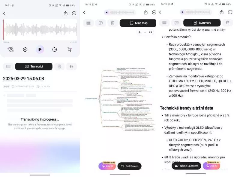 Kromě samotného převodu řeči na text nabízí aplikace Plaud řadu inteligentních funkcí s další přidanou hodnotou. Přepisy jsou automaticky opatřeny časovými kódy pro snadnou orientaci a systém se snaží identifikovat jednotlivé mluvčí v konverzaci, i když prozatím vyžaduje manuální přiřazení jmen pro každou nahrávku.