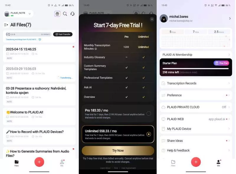 Plaud funguje na principu freemium modelu, který nabízí tři úrovně služeb. Základní bezplatný tarif s názvem Starter Plan umožňuje každý měsíc přepsat až 300 minut nahrávek, což odpovídá zhruba hodině a čtvrt týdně – ideální pro nenáročné uživatele. I v této verzi máte k dispozici klíčové funkce, jako je více než 15 předpřipravených šablon pro shrnutí, tvorba myšlenkových map, rozpoznání jednotlivých mluvčích, možnost ořezání zvukového záznamu, vylepšení pomocí umělé inteligence a ukládání dat do cloudu.