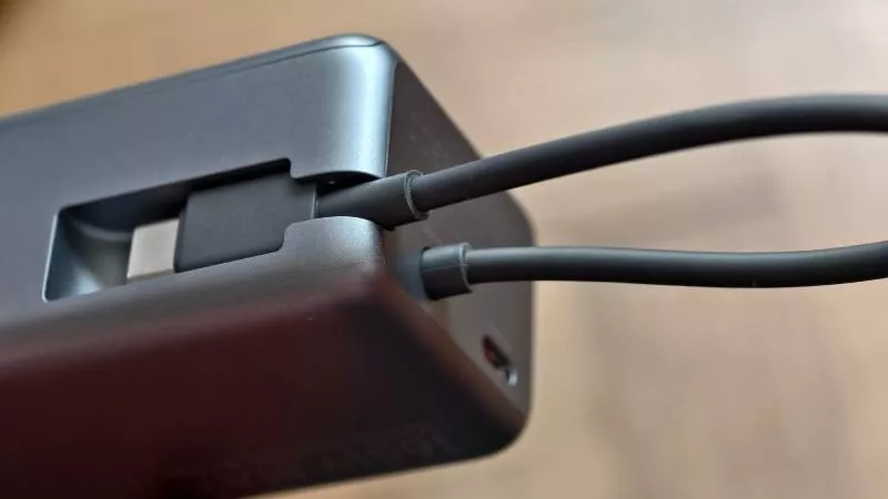 Baterie má napevno integrovaný USB-C kabel s délkou 15 cm, který slouží pro dobíjení připojených zařízení i baterie samotné, my jsme ji ale většinou dobíjeli prostřednictvím druhé USB-C zdířky. Primární integrovaný výstup dokáže dobíjet telefony i notebooky maximálním výkonem 120 W, pokud připojíme k baterii druhé dobíjené zařízení na volný USB-C konektor, může celkový dobíjecí výkon vystoupat až na slibovaných 165 W.