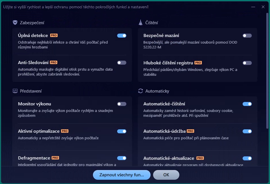 Výrobce nabízí ještě verzi Ultimate, která zahrnuje všechny funkce verze PRO a navíc poskytuje integrovanou antivirovou ochranu, což eliminuje potřebu instalace samostatného antivirového softwaru. K dispozici je také mobilní aplikace pro Android, která nabízí čištění úložiště a základní ochranu zařízení, ale funkčně nedosahuje úrovně desktopové verze.