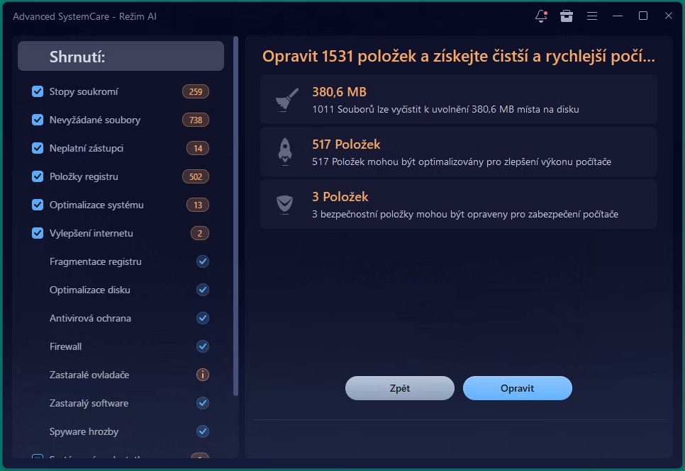 Advanced SystemCare 19 PRO patří mezi komplexní nástroje pro údržbu Windows, které cílí na uživatele hledající jednoduché řešení pro optimalizaci výkonu. Program nabízí klasické funkce jako čištění registrů, odstranění dočasných souborů, správu spouštění či základní ochranu soukromí. Novinkou je širší zapojení AI, která analyzuje stav systému a doporučuje optimalizace podle způsobu používání počítače. Automatické skenování dokáže jedním kliknutím odstranit nepotřebná data a upravit nastavení výkonu, což ocení méně zkušení uživatelé. AI pomáhá i při detekci potenciálních problémů a navrhuje prioritní zásahy bez nutnosti manuálního nastavování. Funkce ochrany soukromí automaticky maže stopy online aktivit a blokuje spyware, čímž chrání uživatelská data před krádeží a infekcí. Pro Gmail, Outlook a Yahoo je k dispozici také filtrování nevyžádané pošty. Při optimalizaci internetového připojení lze dosáhnout až 300 % zrychlení stahování, hraní her a prohlížení webu. Program může provádět pravidelné kontroly a optimalizace automaticky bez nutnosti zásahu uživatele i bez nutnosti hlubokých technických znalostí. Přehledné české rozhraní umožňuje snadnou navigaci a rychlé provedení potřebných úkonů. Další informace najdete na produktové stránce, v on-line nápovědě a ve videorecenzi.