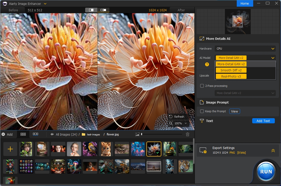 Dávkové zpracování: Aiarty Image Enhancer používá režim dávkového zpracování pro vylepšení více obrázků najednou, například pro vylepšení až 1 000 obrázků. To zaručuje, že zejména profesionálním fotografům a designérům ušetří značné množství času a úsilí.Všestranné modely umělé inteligence: Aiarty nabízí tři specializované modely AI, včetně More-detail GAN, Smooth Diff a Real-Photo, které jsou přizpůsobeny různým typům snímků.