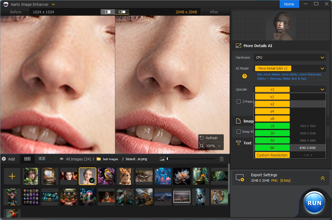 Zvyšování rozlišení: Další důležitou funkcí nástroje Aiarty Image Enhancer je, že umožňuje až 8x zvýšit rozlišení snímků a podporuje rozlišení až 32K. Aby vyhověl různým potřebám, nabízí několik možností zvýšení rozlišení (1x, 2x, 4x, 8x).