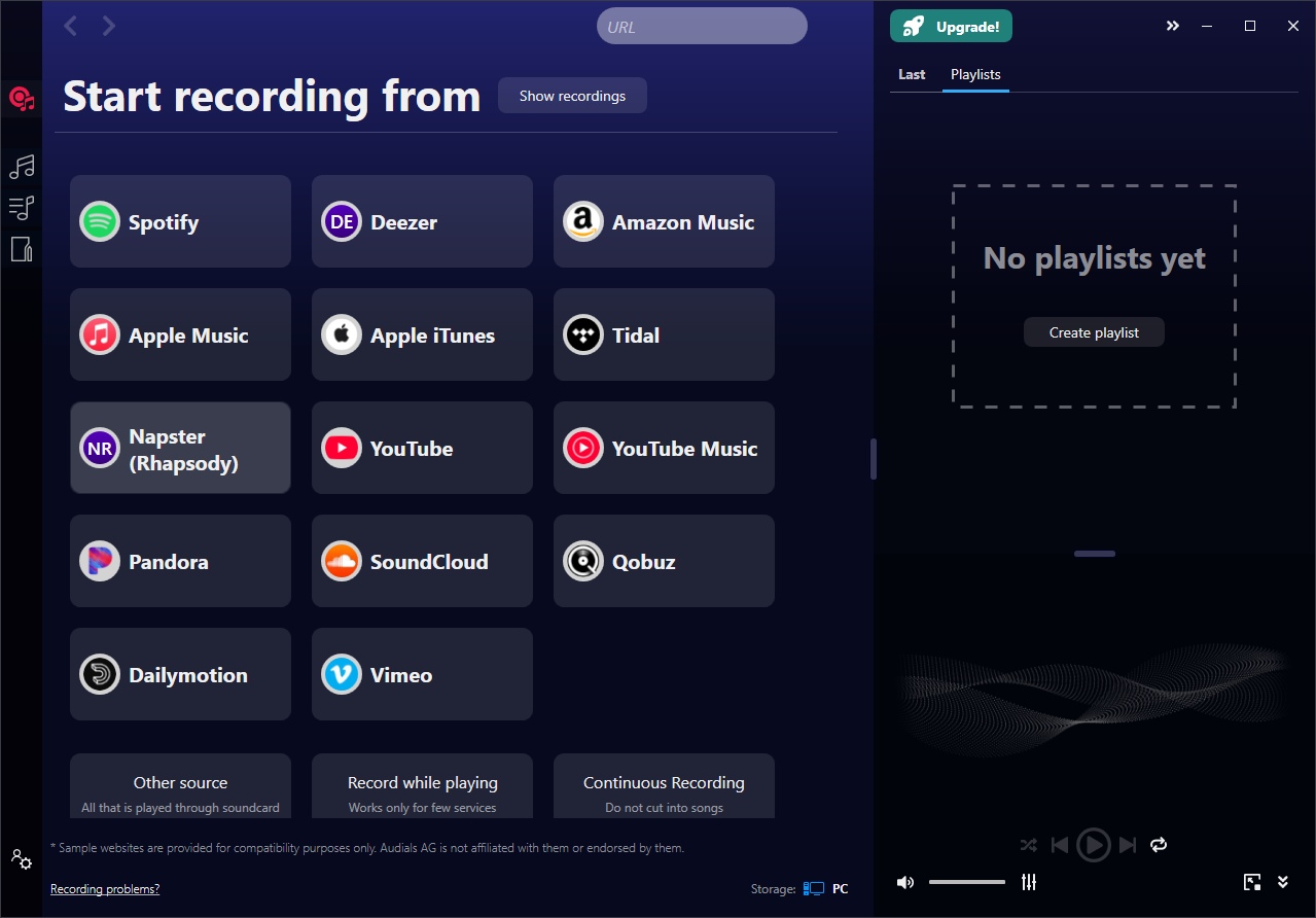 S pomocí aplikace Audials Music SE můžete svoji hudební knihovnu naplnit skladbami ze streamovacích služeb jako jsou Spotify, Deezer, Tidal, Apple Music nebo třeba Amazon Prime Music. Budete ale potřebovat uživatelský účet u těchto služeb. Nabízí se ale i možnost stahovat hudbu z YouTube.