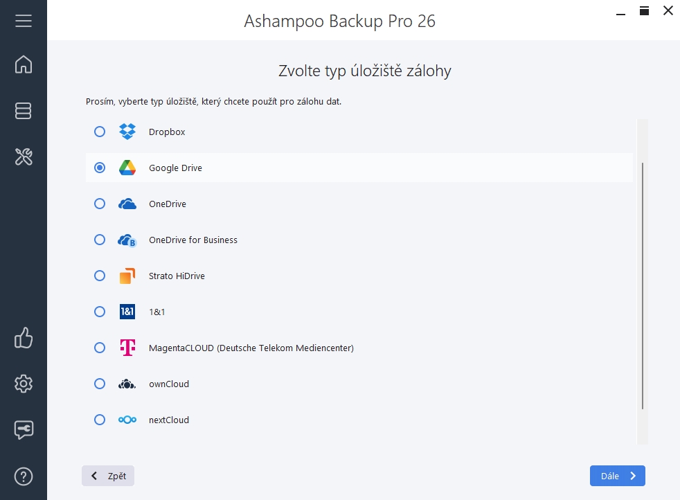 Jestli to myslíte se zálohováním svých dat opravdu vážně, měli byste mít jednu kopii nejdůležitějších souborů uloženou i mimo domov. Cloudová úložiště se k tomuto účelu velmi hodí a Ashampoo Backup Pro podporuje všechny hlavní cloudové služby.