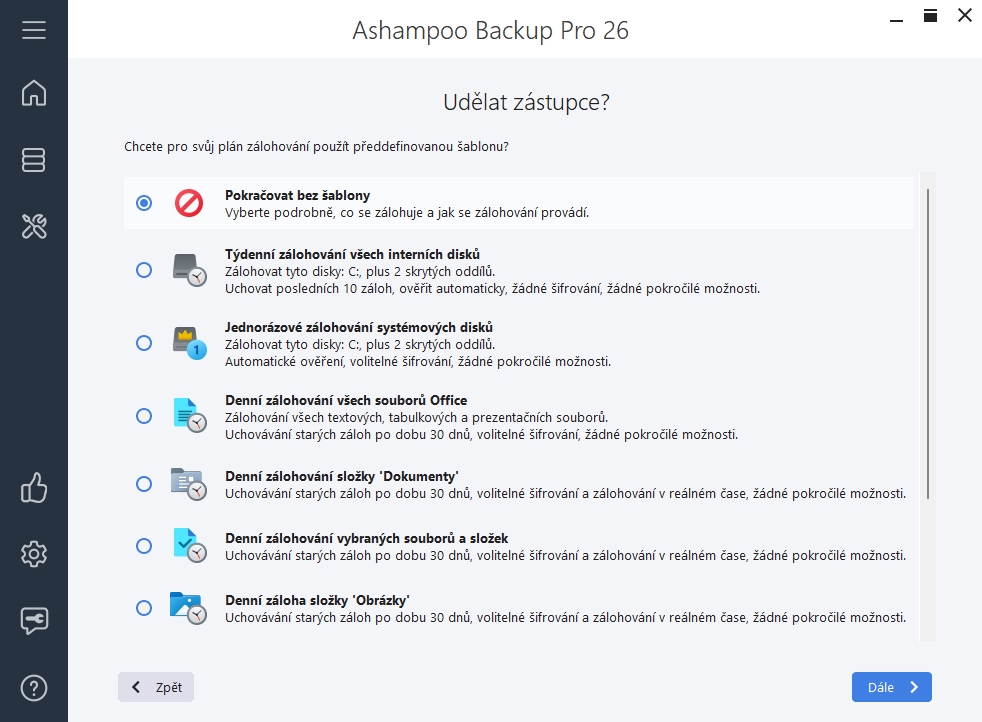 Kromě rychlého zálohování nabízí Ashampoo Backup Pro také řadu užitečných šablon pro běžné zálohovací úlohy na ochranu nejdůležitějších typů souborů. I zálohovací úlohy podle těchto šablon je možné následně přizpůsobit podle individuálních požadavků.