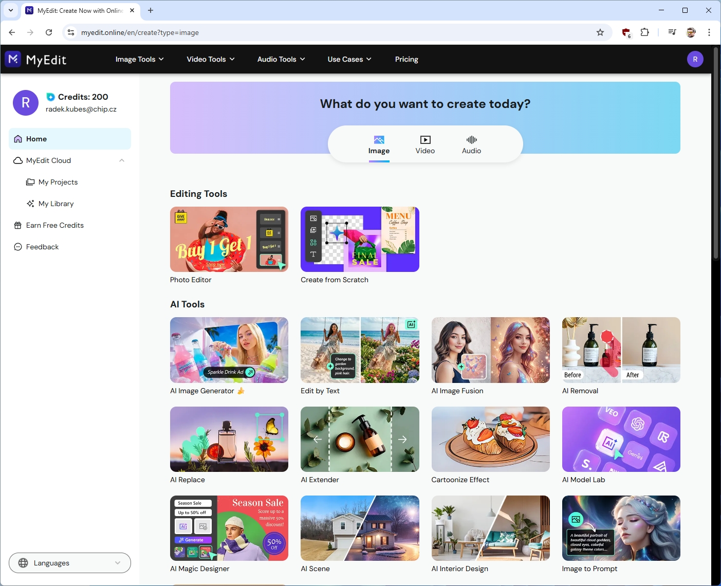 CyberLink MyEdit je online platforma s rozsáhlým katalogem AI nástrojů pro úpravu fotografií, videí i zvuku. Funguje přímo v prohlížeči bez nutnosti cokoli instalovat – takže i velmi náročné výpočty při tvorbě a úpravě obrázků a videa lze realizovat na nevýkonném počítači. Na hlavní stránce najdete přehledně seřazené desítky samostatných nástrojů rozdělených do tří kategorií. Pro úpravu obrázků jsou k dispozici nástroje na automatické odstranění pozadí, zvětšení rozlišení, odstranění nežádoucích objektů ze snímků, generování nových obrázků z textového popisu nebo záměnu obličejů. V kategorii videa najdete stabilizaci záběrů, automatické generování titulků, střih klíčových momentů nebo převod textu na řeč. Audio sekce, která ale není součástí této licence, nabízí oddělení vokálů od hudby, odstranění šumu a ozvěny z nahrávek nebo převod textu na realisticky znějící řeč. Každý nástroj funguje samostatně. Nahrajete soubor, AI ho během několika sekund zpracuje a výsledek si stáhnete zpět do počítače. Čtenáři Chipu mohou využít tříměsíční plný přístup k Pro funkcím pro zpracování obrázků a videa v rámci Creator plánu a využívat všechny šablony. Na začátku každého měsíce se do uživatelského účtu přidá 200 volných kreditů – celkem tedy při registraci a po 30 a 60 dnech. Creator plán nabízí také 50 GB v cloudu pro vaše výtvory. Další informace najdete na produktové stránce a v nápovědě k placeným plánům.