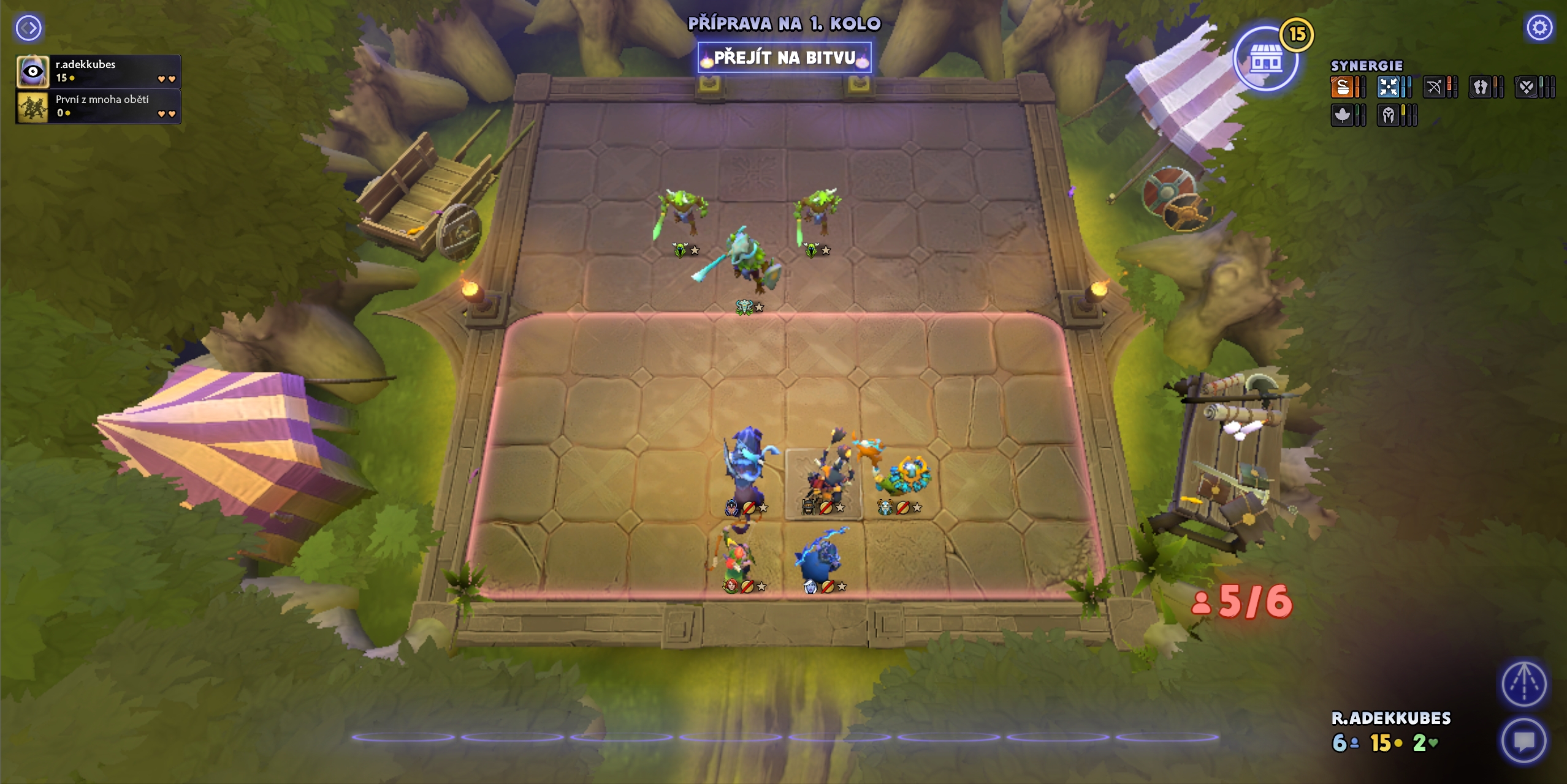 Herní plocha Dota Underlords připomíná šachovnici, na které rozmisťujete hrdiny do strategických pozic. V dolní části obrazovky vidíte nabídku hrdinů k nákupu, vlevo přehled aktuálních aliancí a jejich bonusů. Celé rozhraní je přehledné a snadno čitelné.