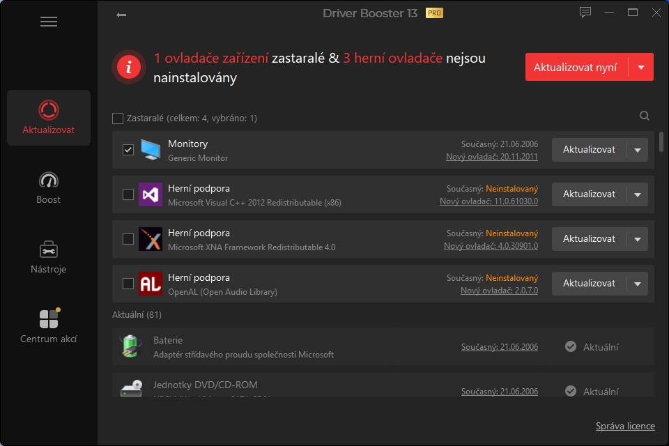 Je velmi pravděpodobné, že Driver Booster odhalí nějaké zastaralé nebo i zcela chybějící ovladače. Není to ale žádný problém – stačí jen kliknout na tlačítko „Aktualizovat nyní“ a Driver Booster příslušné ovladače automaticky stáhne a instaluje.