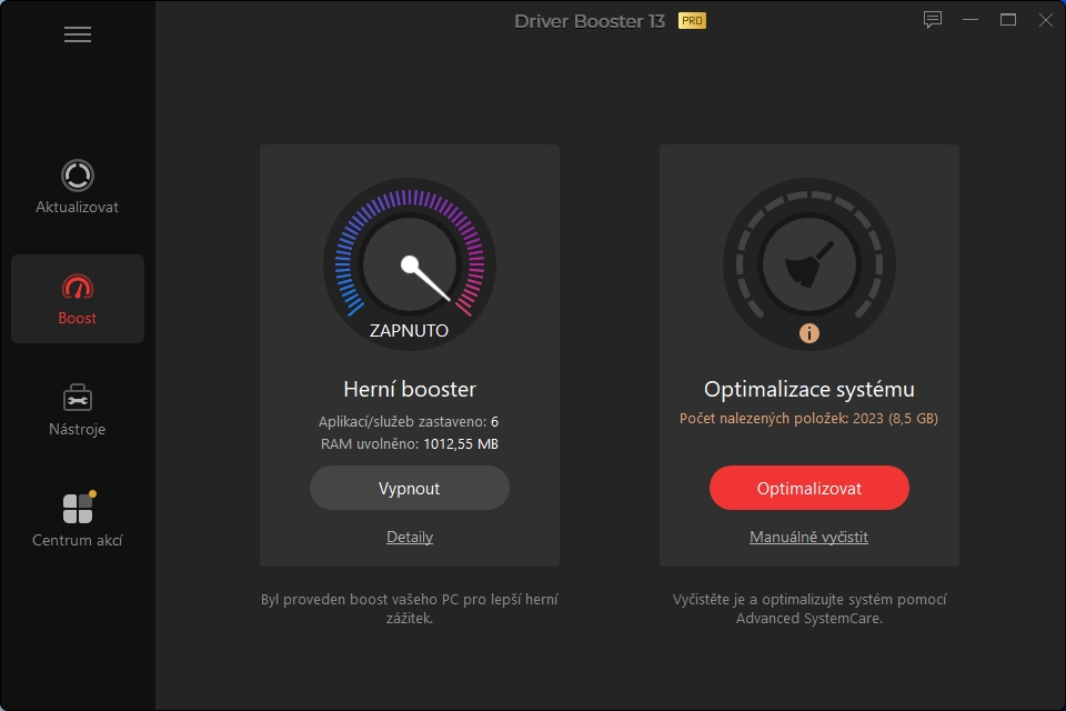 Driver Booster umí také zrychlit počítač a odstranit z něj zbytečnosti. Obě funkce najdete v nabídce „Boost“. Zatímco „Herní booster“ zastaví zbytečné procesy a uvolní kapacitu operační paměti, „Optimalizace systému“ už vyžaduje stažení placené komponenty.