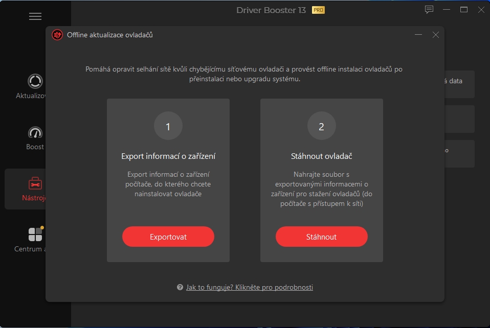Jednou z šikovných funkcí programu Driver Booster je offline aktualizace ovladačů. Tato funkce vám umožní zprovoznit například nefunkční síťovou kartu, kvůli které nelze automaticky instalovat ovladače z internetu. Stačí vám jen USB flash disk a druhý počítač připojený k síti.