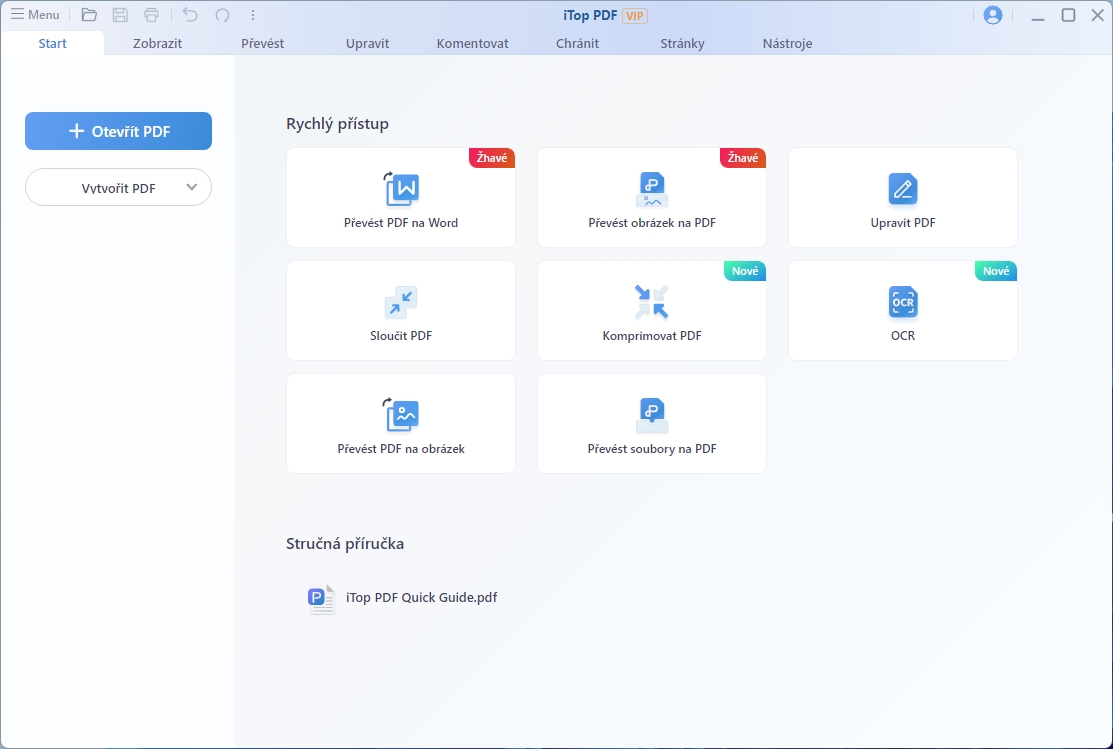 Nejdůležitější funkce programu iTop PDF najdete hned v jeho úvodním okně. Stejně tak z něj můžete rychle otevřít nově nebo naposledy zpracovávané PDF soubory. Další funkce programu najdete přehledně roztříděné na jednotlivých kartách.