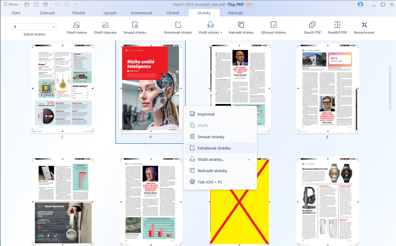 Výborné je provedení funkcí programu iTop PDF na práci s celými stránkami PDF souborů. Velmi snadno můžete měnit jejich pořadí, odstraňovat je, otáčet, ořezávat nebo třeba nahradit. Nechybí ani možnost slučování nebo rozdělování PDF souborů.