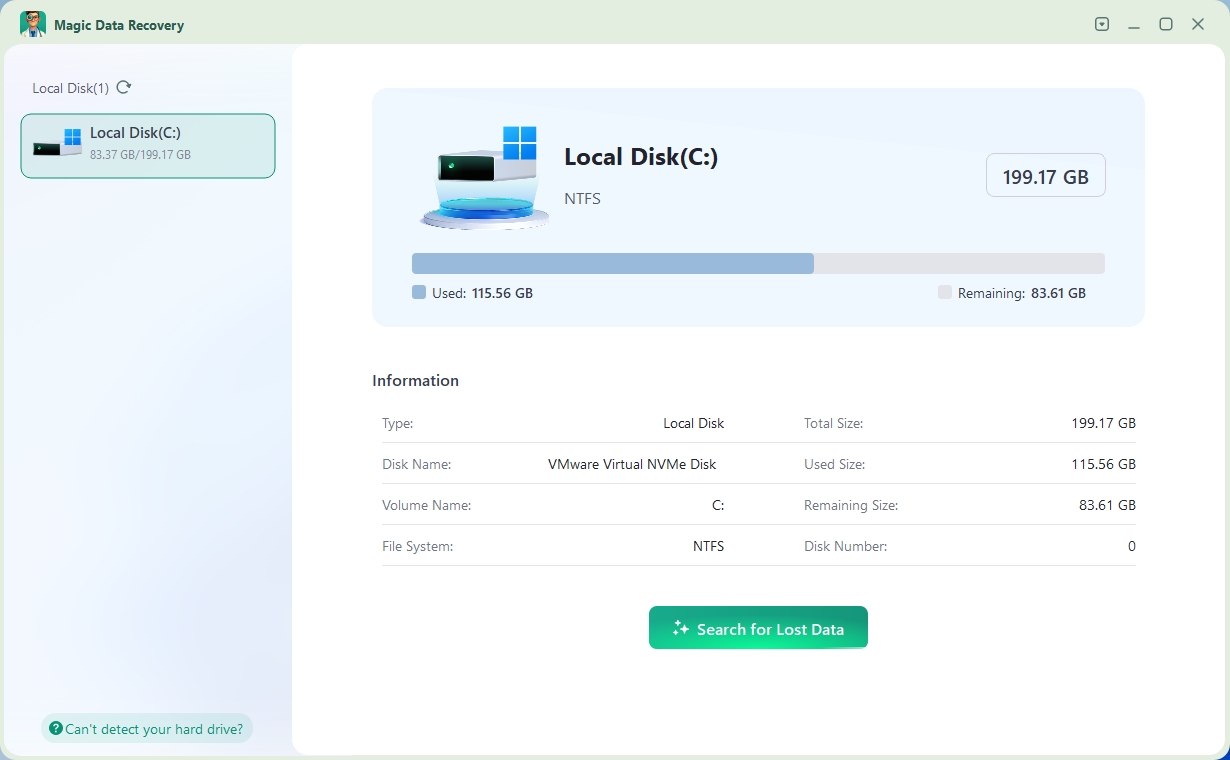 Program Magic Data Recovery má velmi snadné ovládání, kdy stačí jen zvolit interní či externí disk ke kontrole na možnost obnovy smazaných dat, a pak kliknout na tlačítko „Search for Lost Data“. Prohledává se vždy celý disk, bez možnosti zvolit konkrétní typy hledaných souborů.